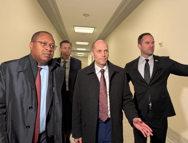 해롤드 로저스 쿠팡 한국법인 임시 대표(가운데)가 23일(현지시간) 미국 워싱턴DC의 연방 하원 법사위 회의장에 비공개 증언을 하기 위해 들어가고 있다. [사진=연합뉴스] |