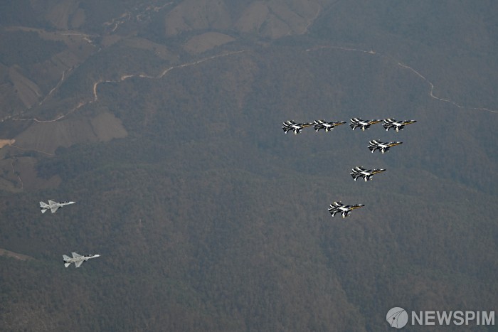 [서울=뉴스핌] 공군 특수비행팀 블랙이글스가 사우디 ‘세계 방위산업 전시회(WDS 2026)’ 참가를 마치고 24일 한국으로 복귀했다. 지난 18일 블랙이글스 T-50B 7대(오른쪽)와 태국 공군 T-50TH 2대가 한 태 공군 우정비행을 실시하고 있다. [사진=공군] 2026.02.24 photo@newspim.com