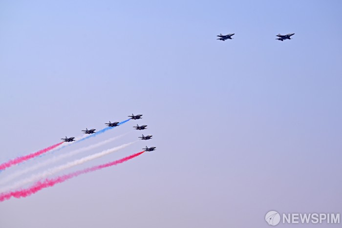 [서울=뉴스핌] 공군 특수비행팀 블랙이글스가 사우디 ‘세계 방위산업 전시회(WDS 2026)’ 참가를 마치고 24일 한국으로 복귀했다. 지난 18일 블랙이글스 T-50B 7대(뒤쪽)와 태국 공군 T-50TH 2대(앞쪽)가 한 태 공군 우정비행을 실시하고 있다. [사진=공군] 2026.02.24 photo@newspim.com