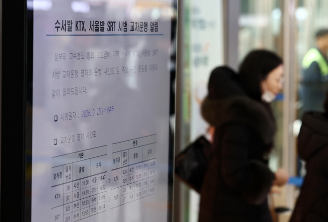 SRT-KTX 교차운행 예매 시작 - 서울역발 SRT·수서역발 KTX 시범 교차운행에 대한 예매가 시작된 11일 서울 용산구 서울역에 운행 관련 안내문이 게시돼 있다. 뉴시스 |