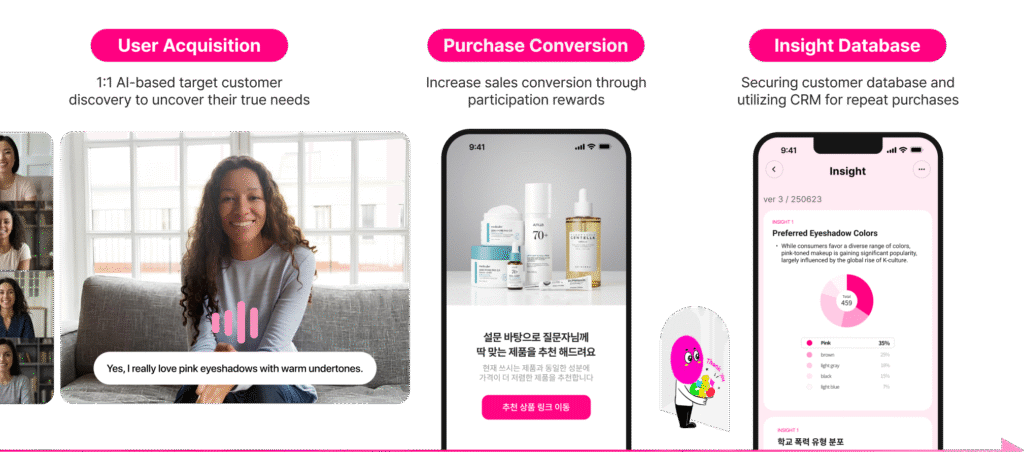 K-뷰티 수출이 빠르게 성장하고 있지만, 해외 소비자의 니즈를 정확히 파악하기 어려워 고비용·저효율의 마케팅 구조가 지속되고 있다. CURI AI는 AI가 직접 해외 소비자를 인터뷰해 구매 의사·선호도·거부 요인까지 정성·정량 데이터로 분석하는 솔루션이다. 기존 설문조사나 리서치 대비 1~2일 내 결과 도출, 건당 수만 원 수준의 비용 구조, 1:1 심층 인터뷰(IDI) 기반 데이터 확보가 강점이다. K-뷰티 브랜드와 글로벌 마케팅 에이전시는 이를 통해 제품 메시지 검증, 시장 테스트, 현지화 전략 수립을 빠르게 실행할 수 있다.