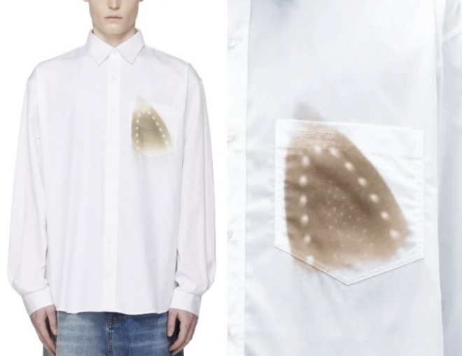 프랑스의 명품 스트릿 패션 브랜드 ‘베트멍’이 최근 출시한 ‘화이트 아이로닝 번 그래픽 셔츠’. 면 100% 소재의 셔츠 왼쪽 가슴 부분에 다림질하다 태운 자국을 본뜬 디자인이 프린트돼 있다. 160만원대에 판매 중이다. 자료 : 베트멍 공식 인스타그램 |