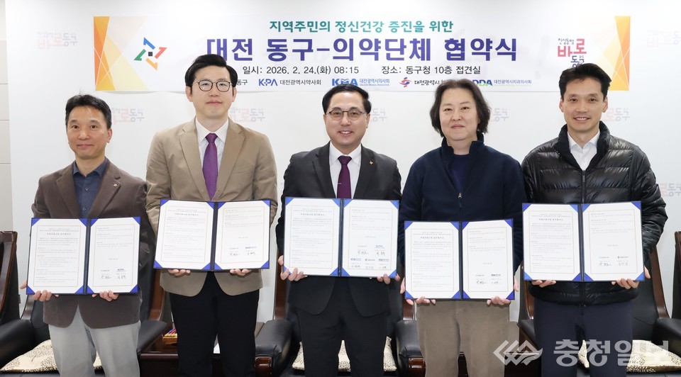 대전시 동구는 24일 대전시약사회 동구분회, 대전시의사회 동구분회, 대전시한의사회 동구분회, 대전시치과의사회 동구분회와 '마음이음사업' 업무협약을 체결하고 자살 고위험군 조기 발굴을 위한 현장 중심 협력체계를 본격 가동했다.