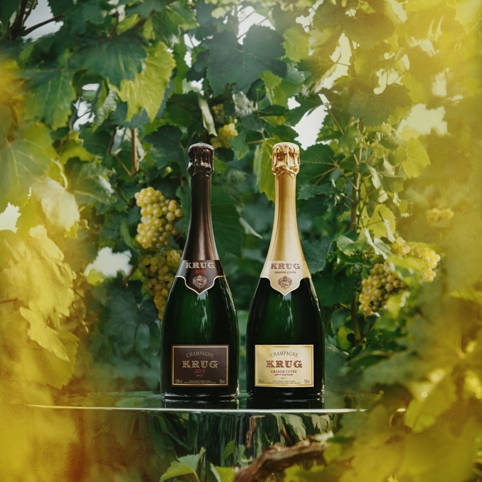 이번 세트는 단일 빈티지의 개성을 담은 '크루그 2013(Krug 2013)'과, 여러 해의 와인을 아상블라주한 '크루그 그랑 퀴베 169 에디션(Krug Grande Cuvée 169ème Édition)'으로 구성된다. 동일한 해의 수확에서 출발했지만 서로 다른 접근 방식을 통해 완성된 두 샴페인은 크루그가 자연을 해석하는 방식의 깊이와 다양성을 보여준다.