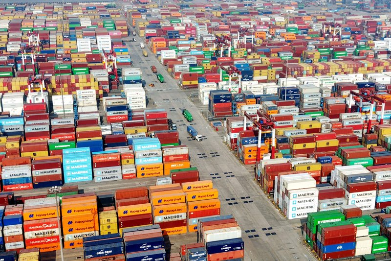 13일 중국 산둥성 칭다오 항구에서 촬영된 컨테이너 부두.AFP연합뉴스