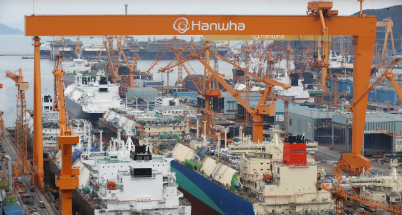 한화오션 거제사업장에 대형 크레인과 건조 중인 선박이 보이고 있다.[사진=뉴스1] |