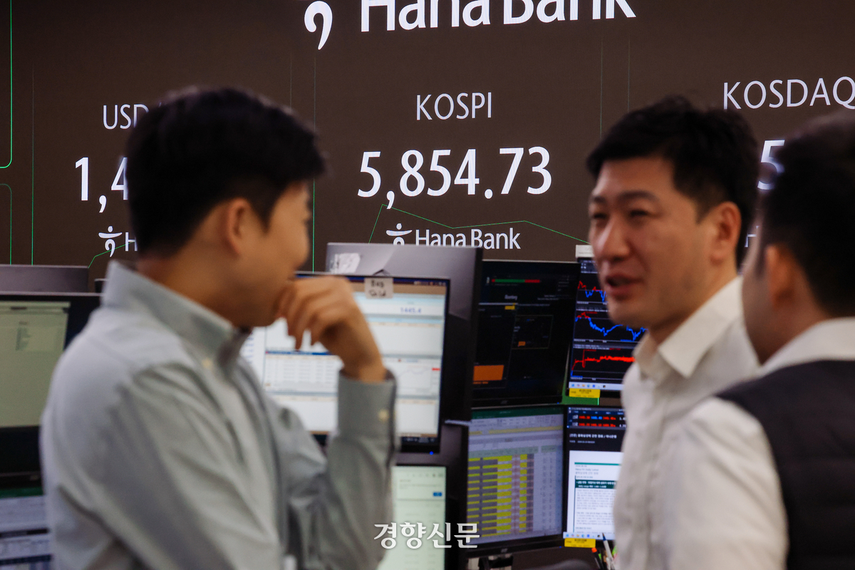 코스피 지수 6,000포인트의 기대감을 안고 장이 시작된 24일 서울 중구 하나은행 딜링룸에서 직원들이 업무를 보고 있다. 이날 코스피는 전날대비 0.13%오른 5853.48로 출발했다. 이준헌 기자 |