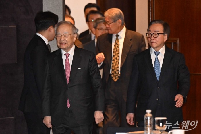 (왼쪽 첫 번째)손경식 한국경영자총협회장과 이동근 경총 상근부회장을 비롯한 참석자들이 24일 오전 서울 중구 웨스틴조선 호텔에서 열린 제192회 이사회 및 제57회 정기총회에 입장하고 있다. 사진=강민석 기자 kms@newsway.co.kr