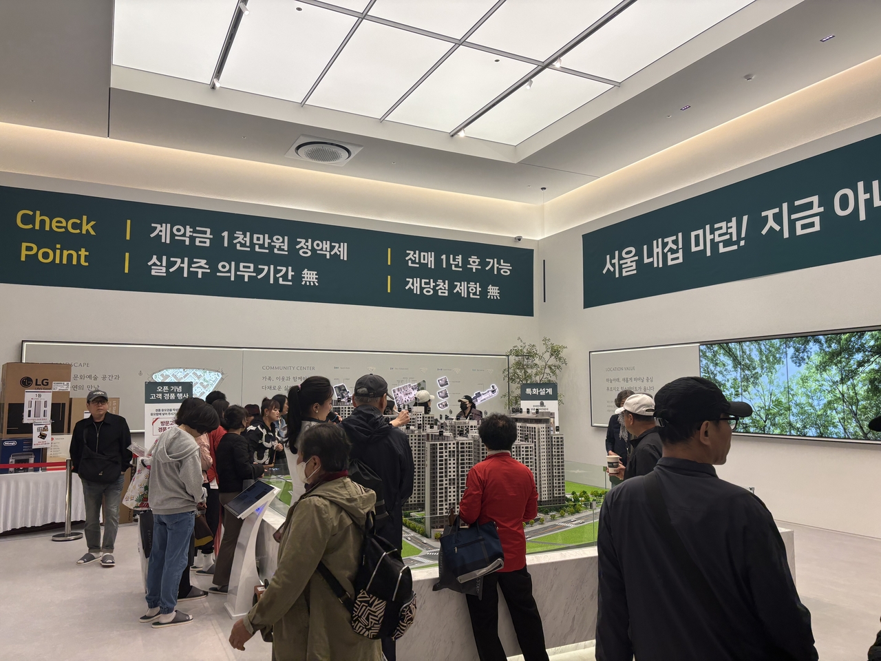 서울의 한 견본주택에서 단지 모형도를 둘러보는 방문객들의 모습. [헤럴드 DB] |