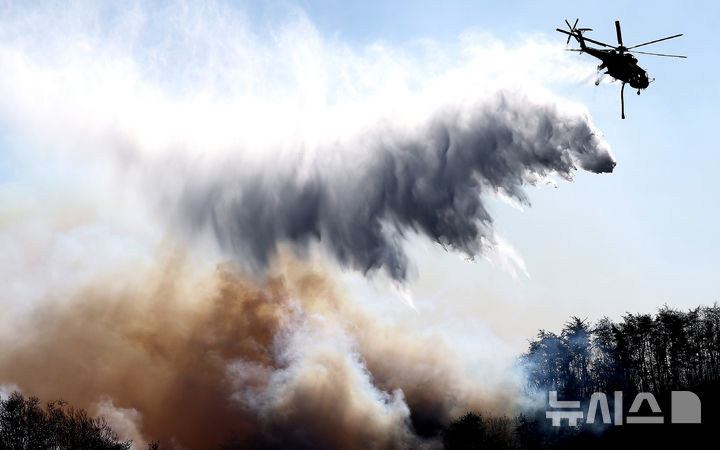 [경주=뉴시스] 이무열 기자 = 8일 오후 경북 경주시 문무대왕면 입천리에서 발생한 산불이 강풍을 타고 확산되는 가운데 소방헬기가 진화 작업을 벌이고 있다. 2026.02.08. lmy@newsis.com |