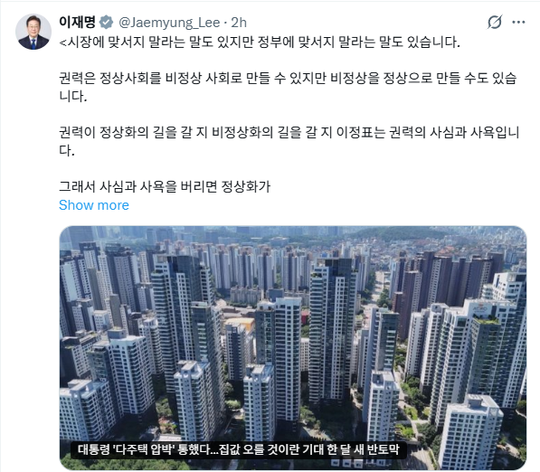 이재명 대통령은 24일 자신의 엑스(X, 옛 트위터) 계정에 "우리 국민은 수도권 아파트시장이 비정상임을 알고 있고, 이 비정상의 정상화를 지지한다"고 적었는데요. 이어 "권력은 규제, 세제, 금융, 공급 등 정상화를 위한 막강한 수단을 가지고 있다"면서 필요할 경우 부동산시장 정상화를 위해 이들 수단을 동원할 수 있다는 걸 강력 암시했습니다.