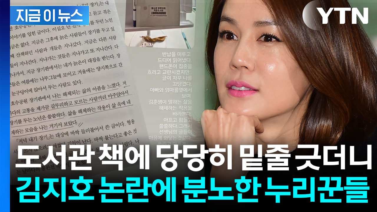 김지호는 어제 자신의 소셜 미디어에 공공 도서관에서 빌린 김훈 작가의 소설 '저만치 혼자서'의 표지를 올리고, 책 본문에 볼펜으로 여러 구절에 밑줄을 그어놓은 부분을 확대한 사진을 올렸다가 비판을 받았습니다.
