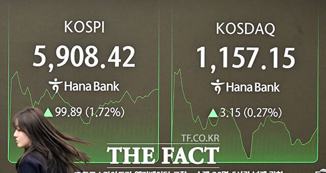 24일 한국거래소에 따르면 지난 23일 코스피는 전 거래일 대비 0.65% 오른 5846.09에 거래를 마쳤으나 장중 최고 5931.86까지 오르며 역대 최고치를 경신했다. 24일 장에서도 장 초반 하락 전환 후 반등에 성공해 5900선에서 등락을 이어가고 있다.
