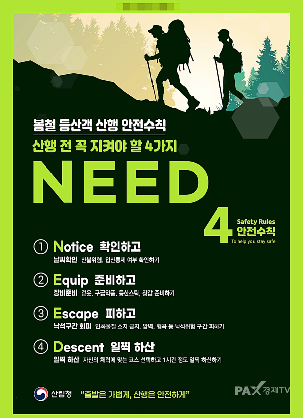 박은식 산림청장 직무대리는 "안전한 산행은 특별한 기술이 아니라 기본 안전수칙을 지키는 것에서 시작된다"며 "산행 전 NEED 안전수칙을 확인하는 작은 실천이 산행 사고 예방과 산불 예방으로 이어지는 만큼 국민 여러분의 적극적인 참여를 부탁한다"고 전했습니다.