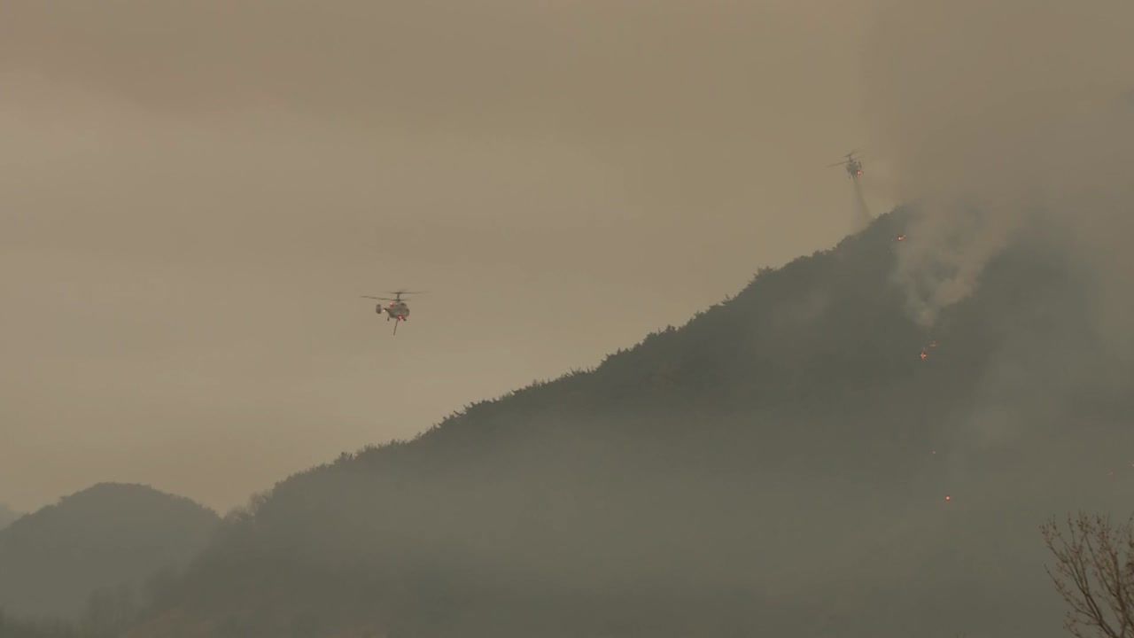 전체 화선은 6.5km에 달하지만, 34대에 달하는 헬기 진화 덕분에 속도가 붙으면서 진화 작업이 남은 구간은 1km로 줄었습니다.