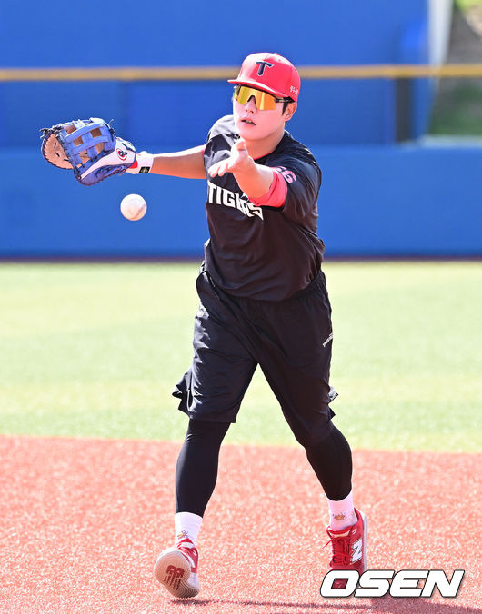 경기를 앞두고 KIA 오선우가 수비 훈련을 펼치고 있다. 2026.02.24 / dreamer@osen.co.kr