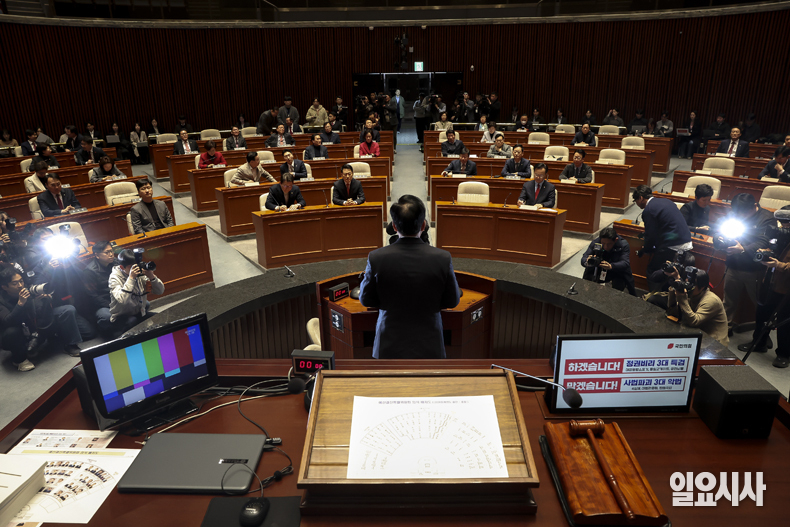 이날 열린 의원총회에서 국민의힘은 더불어민주당의 법안 강행 처리 방침에 대한 대응 방안을 논의한다.