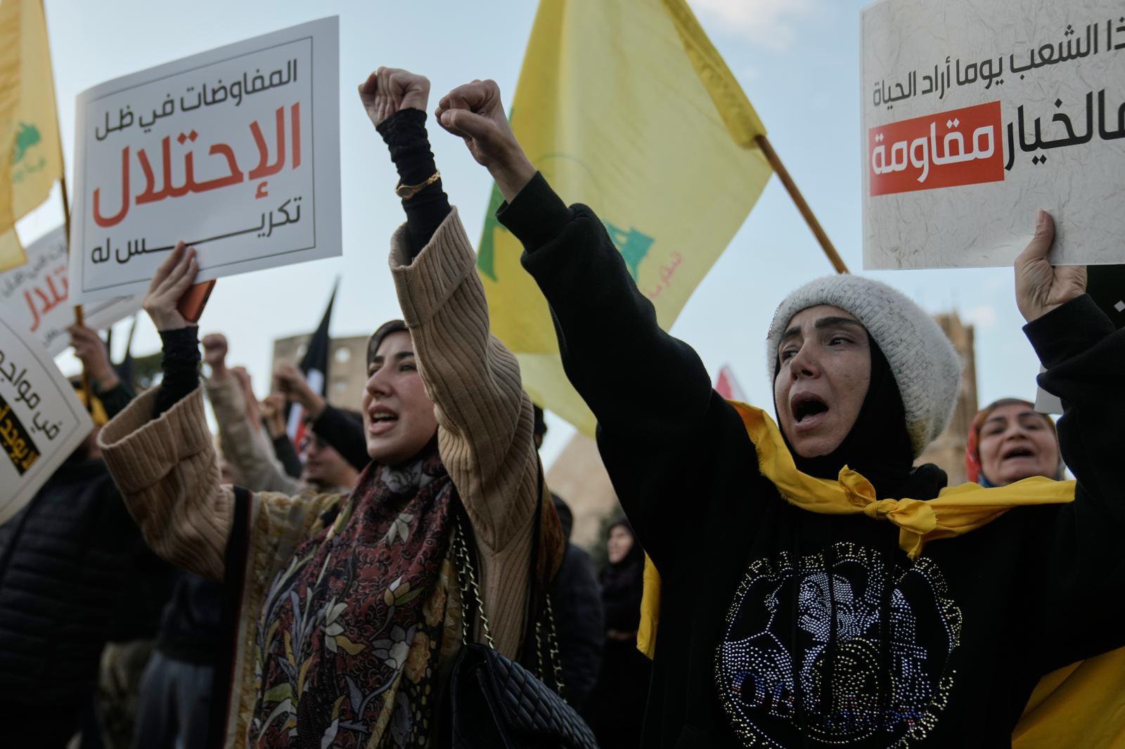 4일 레바논 베이루트의 유엔서아시아경제사회위원회(ESCWA) 본부 앞에서 헤즈볼라 지지자들이 최근 이스라엘군의 레바논 내 군사 행동을 규탄하고 남부 국경 긴장 고조 속 국제사회의 개입을 촉구하며 구호를 외치고 있다. 2026.02.24.[베이루트=AP/뉴시스] |