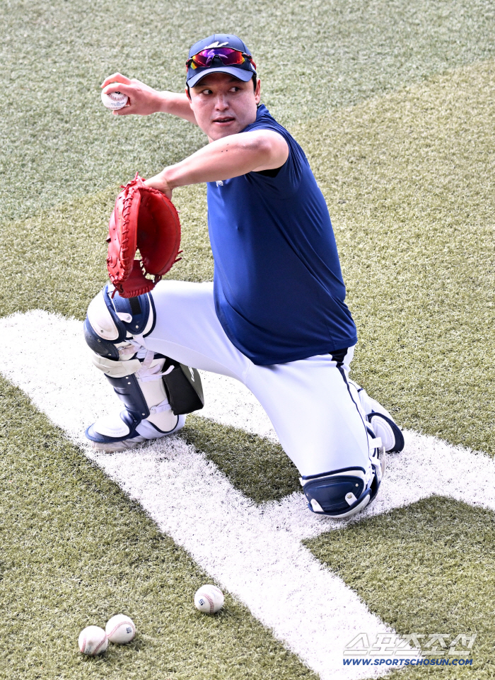 24일 일본 오키나와 가데나 구장에서 열린 야구 대표팀과 KIA 타이거즈의 평가전. 박동원이 수비 훈련을 하고 있다. 오키나와(일본)=박재만 기자 pjm@sportschosun.com/2026.02.24/
