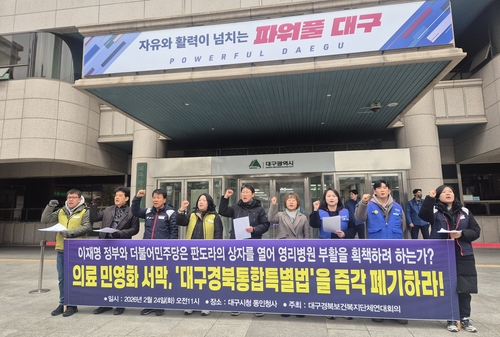(대구=연합뉴스) 박세진 기자 = 대구경북보건복지단체연대회의는 24일 "영리병원 설립 허용 독소조항이 포함된 대구·경북 행정통합 특별법을 즉각 폐기하라"고 주장했다.