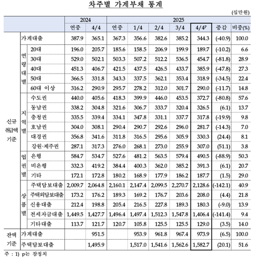신규취급액 감소는 연령·지역·업권·상품별로 보면 30대와 수도권, 은행권, 주택 관련 대출에 집중됐다. 30대(-818만원), 수도권(-808만원), 은행(-889만원), 주택담보대출(-1421만원), 전세자금대출(-1414만원)을 중심으로 감소했다.