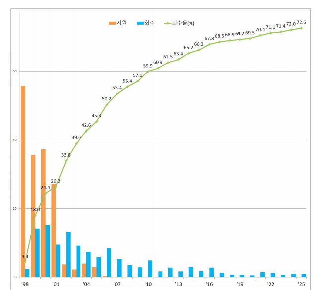 정부가 1997년 외환위기 당시 투입한 공적자금의 누적 회수율이 1년 새 0.5%포인트(P) 상승해 72.5%를 기록했다.