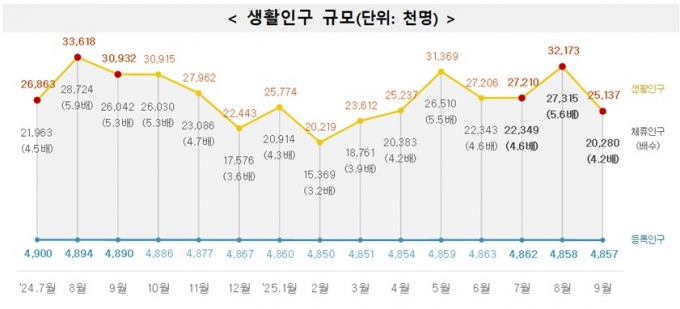 월별로 보면 지난해 7월 생활인구는 약 2721만명, 8월은 약 3217만명, 9월은 약 2514만명이었다. 7·8월은 전년 동월과 비슷한 수준이었으나, 9월은 추석 연휴 영향 등으로 크게 감소해 3분기 전체로는 전 분기 및 전년 동분기 대비 소폭 줄었다. 정부는 지난해 9월 추석 연휴에 따른 기저효과와 올해 10월 긴 연휴(개천절~추석~한글날)로 이동이 분산된 점이 감소 요인으로 작용한 것으로 분석했다.
