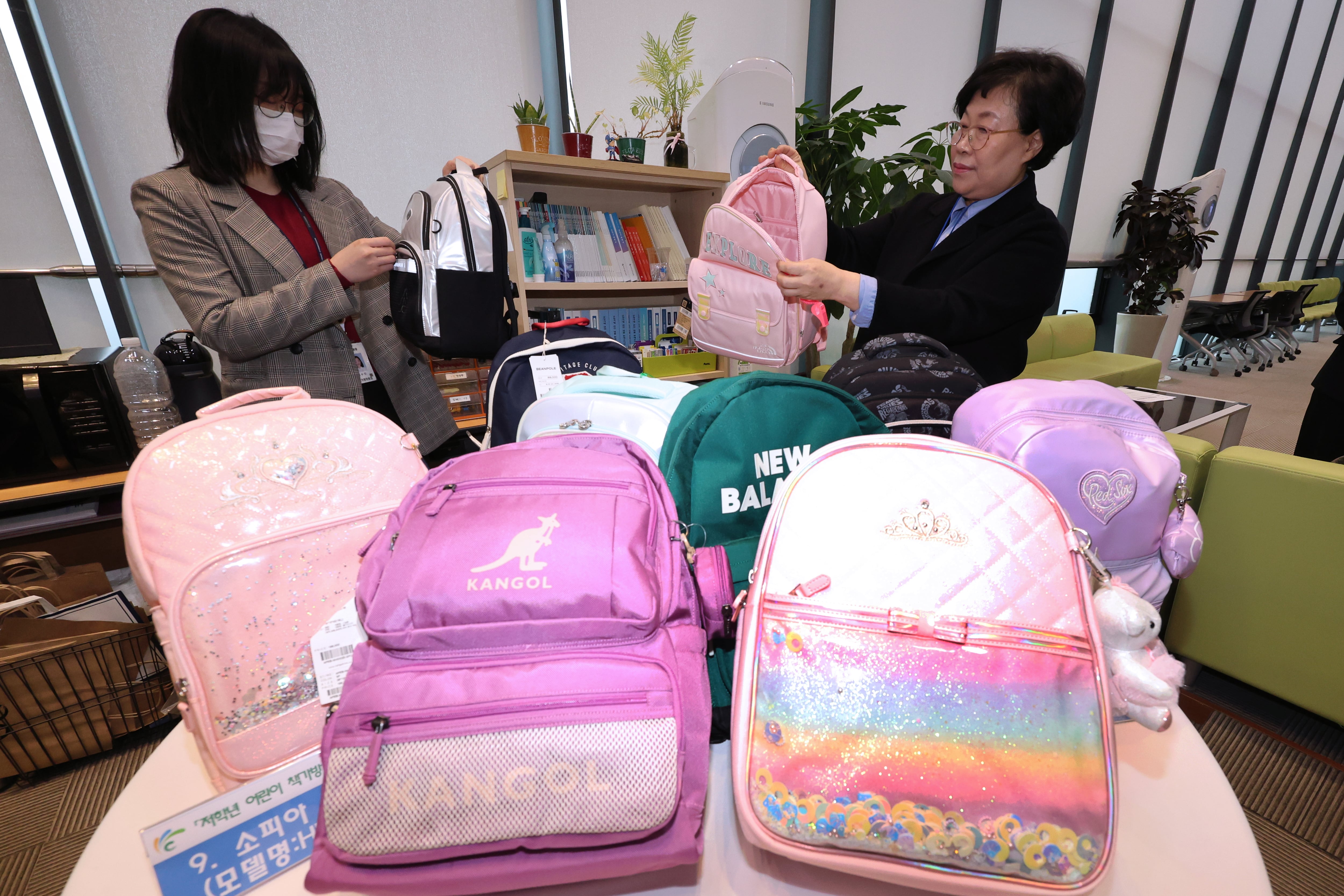 한국소비자연맹 직원들이 24일 정부세종청사 공정거래위원회 기자실에서 시중에 판매 중인 저학년 어린이 책가방에 대한 비교 분석 결과를 발표한 뒤 해당 가방들을 살펴보고 있다./연합뉴스 |