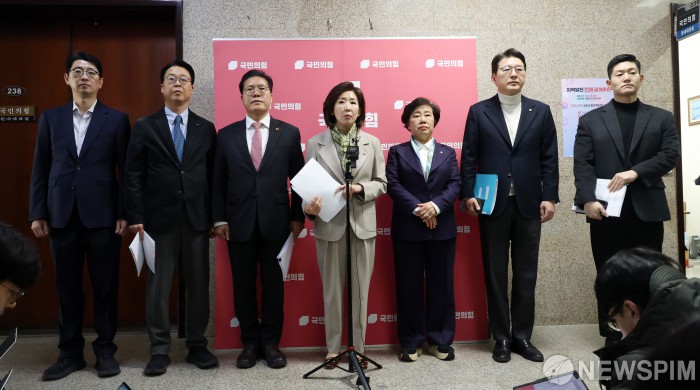 [서울=뉴스핌] 정일구 기자 = 국회 법제사법위원회 국민의힘 위원들이 24일 오전 서울 여의도 국회에서 법사위 전체회의 개의 지연 관련 항의 기자회견을 하고 있다. 왼쪽부터 주진우, 곽규택, 송석준, 조배숙, 나경원, 신동욱, 김재섭 의원. 2026.02.24 mironj19@newspim.com