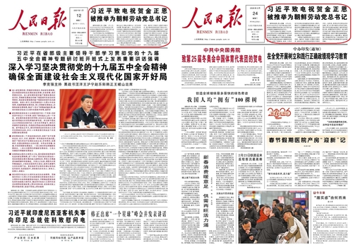인민일보는 2021년 1월 김 위원장이 노동당 총비서로 추대됐을 당시에도 같은 위치인 1면 상단에 시 주석의 축전 기사를 실었다.