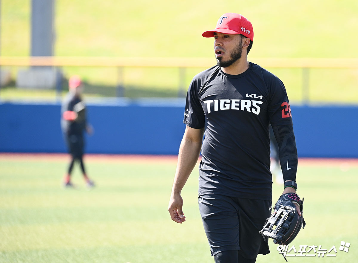 (엑스포츠뉴스 오키나와(일본), 고아라 기자) 24일 일본 오키나와 카데나 구장에서 열리는 기아 타이거즈와 WBC 대표팀의 연습경기에 앞서 기아 해럴드 카스트로가 훈련을 하고 있다.