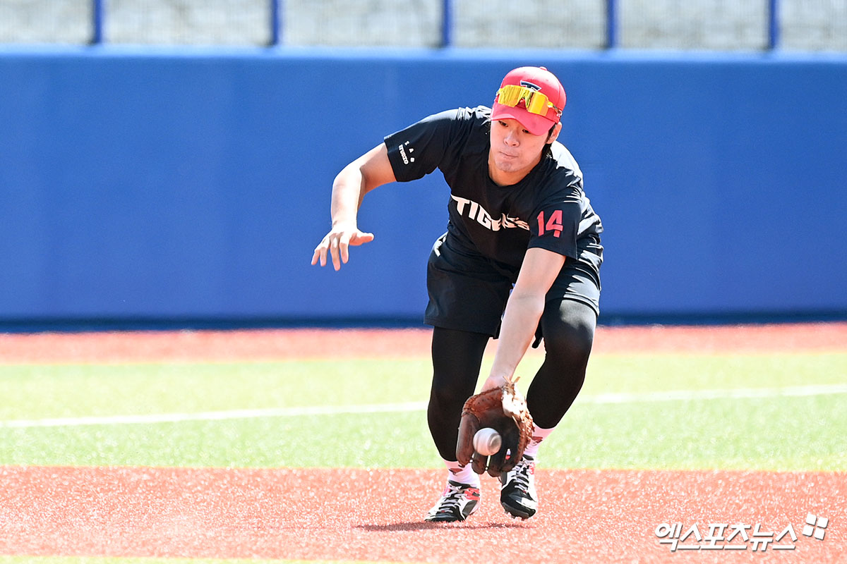 (엑스포츠뉴스 오키나와(일본), 고아라 기자) 24일 일본 오키나와 카데나 구장에서 열리는 기아 타이거즈와 WBC 대표팀의 연습경기에 앞서 KIA 김규성이 훈련을 하고 있다.