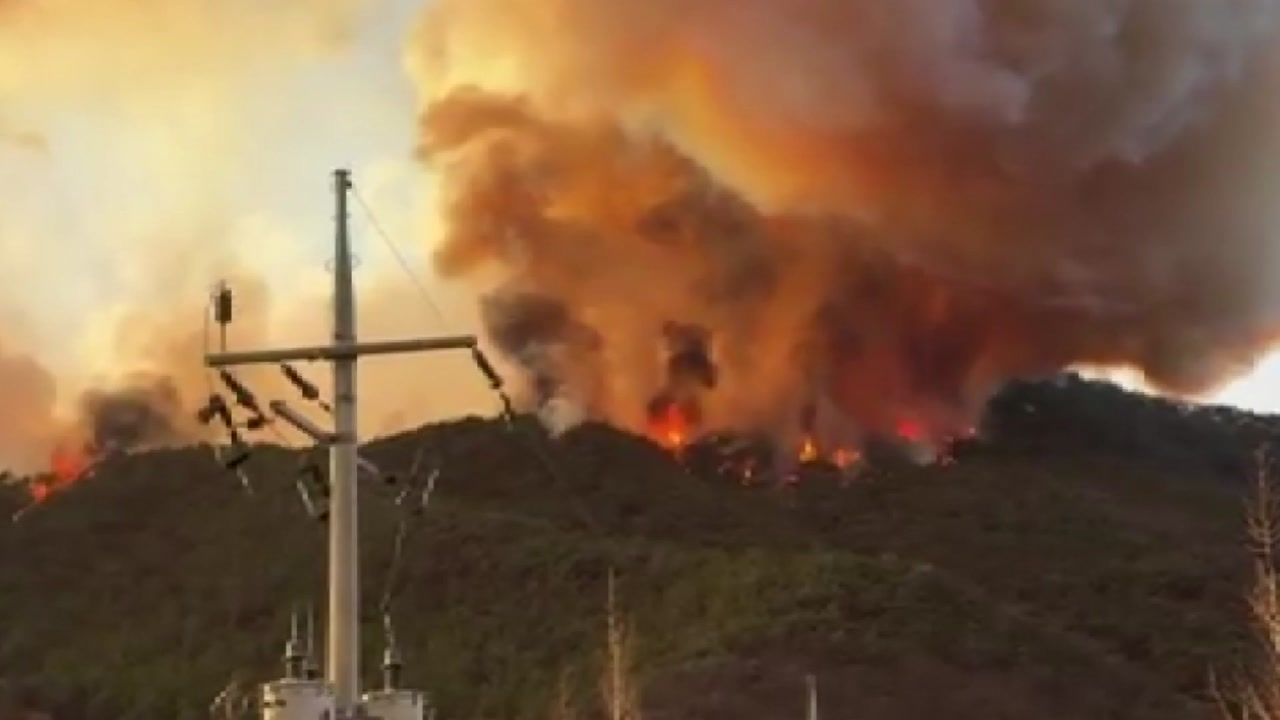 산꼭대기 빽빽한 나무 사이로 시뻘건 불길이 기세를 올립니다.