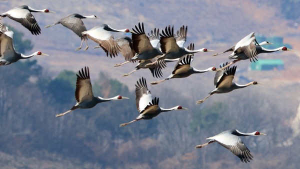 (사진제공=창원특레시)재두루미들의 주남저수지 비행 징면. |