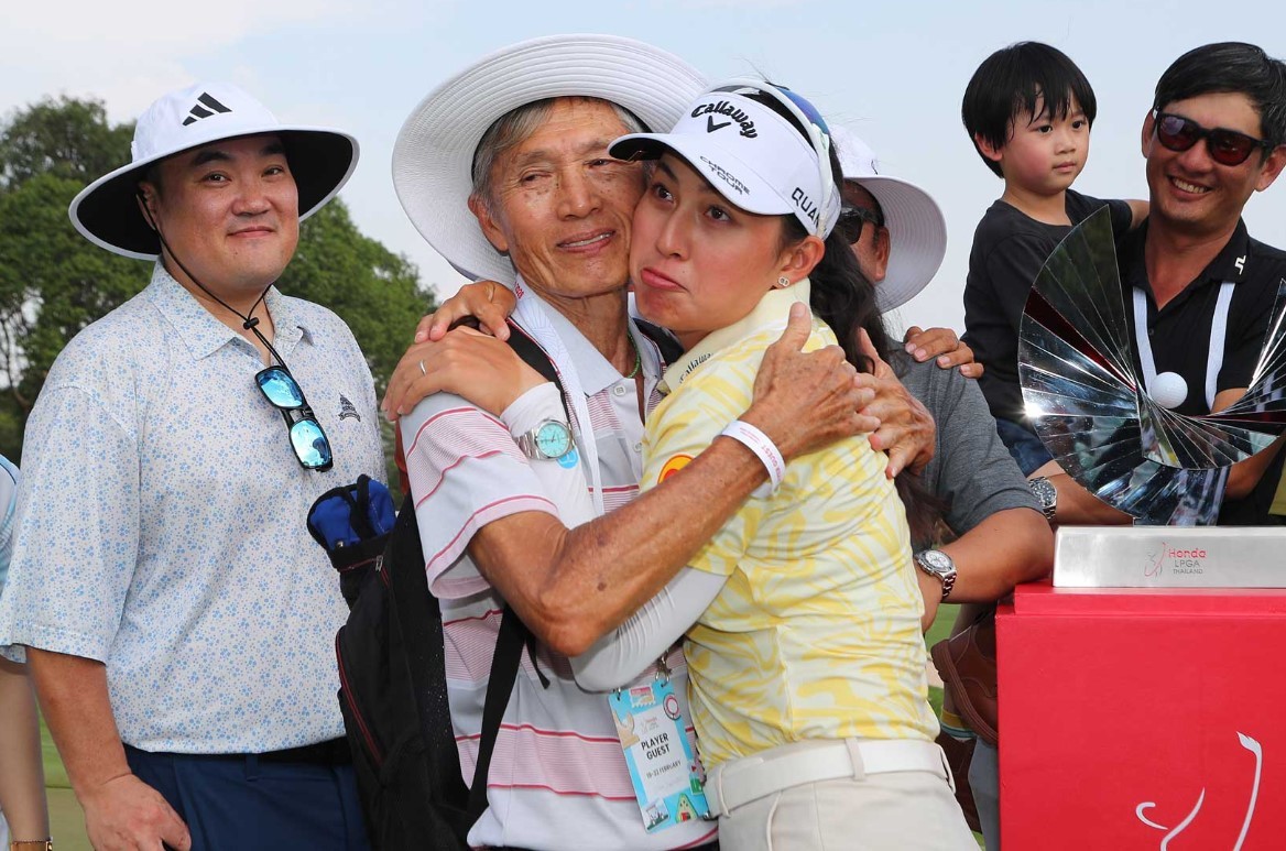 [서울=뉴스핌] 박상욱 기자 = 지노 티띠꾼이 22일 혼다 LPGA 타일랜드 우승을 일군 뒤 가족들과 기쁨을 나누고 있다. [사진=LPGA] 2026.02.24 psoq1337@newspim.com |