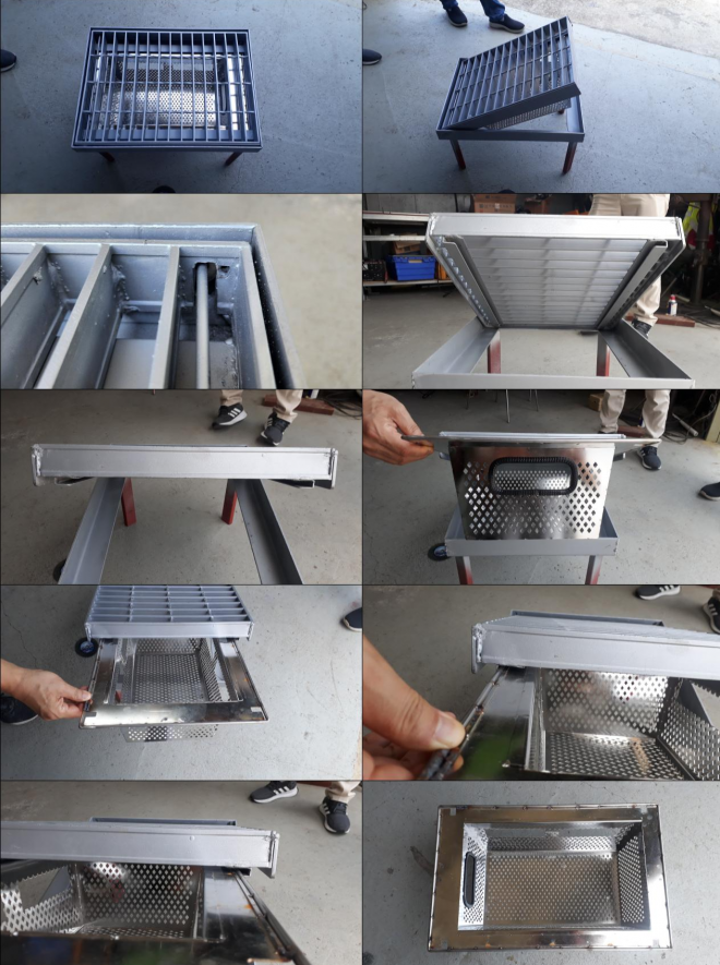 ECO 그레이팅의 핵심은 빗물받이 뚜껑과 내부 거름망을 하나로 결합한 일체형 구조다. 기존 제품이 뚜껑을 연 뒤 안쪽 거름망을 따로 들어 올려야 해 작업이 번거로웠던 것과 달리, 이 제품은 뚜껑을 열면 거름망이 함께 약 45도 각도로 올라가 한 번에 쓰레기를 걷어낼 수 있도록 설계됐다.