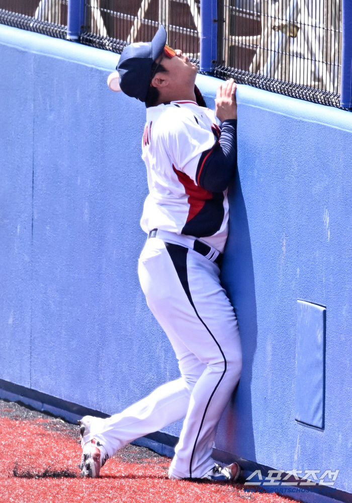 24일 일본 오키나와 가데나 구장에서 열린 야구 대표팀과 KIA 타이거즈의 평가전. KIA 데일 뜬공 때 1루수 문보경이 펜스와 충돌하고 있다. 오키나와(일본)=박재만 기자 pjm@sportschosun.com/2026.02.24/