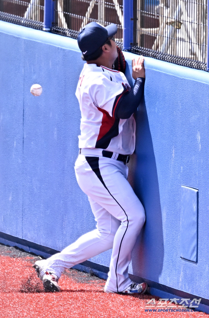 24일 일본 오키나와 가데나 구장에서 열린 야구 대표팀과 KIA 타이거즈의 평가전. KIA 데일 뜬공 때 1루수 문보경이 펜스와 충돌하고 있다. 오키나와(일본)=박재만 기자 pjm@sportschosun.com/2026.02.24/