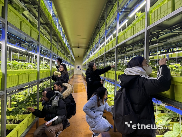 지난해 코이카 농업분야 석사학위과정 연수생들이 문경시 LED식물공장 방문해 친환경 수직형 상토 식물공장을 체험하고 있다. |