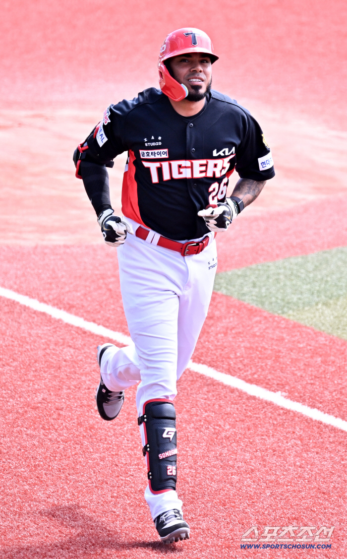 24일 일본 오키나와 가데나 구장에서 열린 야구 대표팀과 KIA 타이거즈의 평가전. 카스트로가 투런포를 날린 뒤 환호하고 있다. 오키나와(일본)=박재만 기자 pjm@sportschosun.com/2026.02.24/ |