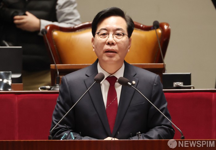 [서울=뉴스핌] 정일구 기자 = 송언석 국민의힘 원내대표가 24일 오전 서울 여의도 국회에서 열린 의원총회에서 모두발언을 하고 있다. 2026.02.24 mironj19@newspim.com