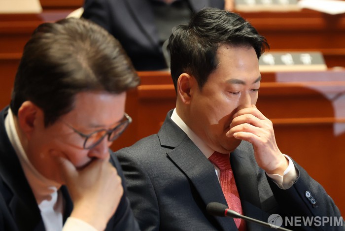 [서울=뉴스핌] 정일구 기자 = 장동혁 국민의힘 대표와 신동욱 수석최고위원이 24일 오전 서울 여의도 국회에서 열린 의원총회에 참석해 있다. 2026.02.24 mironj19@newspim.com
