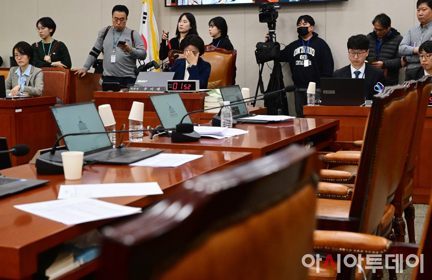 아시아투데이 이병화 기자 = 추미애 국회 법사위원장이 24일 국회에서 열린 법제사법위원회 전체회의에서 생각에 잠겨 있다. 국민의힘 의원들은 전남광주통합특별시 설치를 위한 특별법안(대안)이 통과되자 퇴장했다.