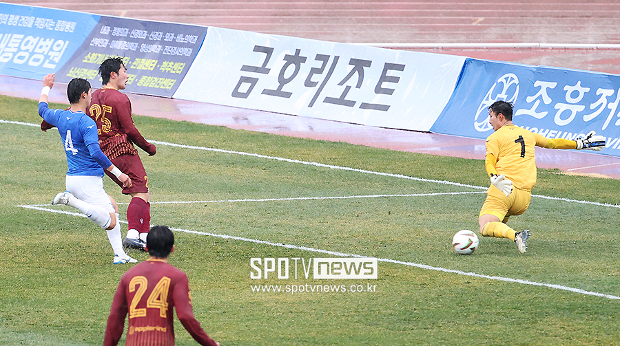 [스포티비뉴스=통영, 곽혜미 기자] '제62회 춘계대학축구연맹전' 한산대첩기 연세대와 경희대의 결승전이 24일 오후 경상남도 통영공설운동장에서 열렸다. 연세대 골키퍼 김현이 골을 막아내고 있다.