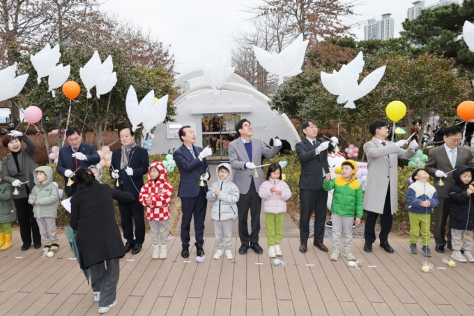 박형준 부산시장(가운데) 등이 24일 키즈카페 개소식에서 풍선을 띄우고 있다./사진제공=부산시 |