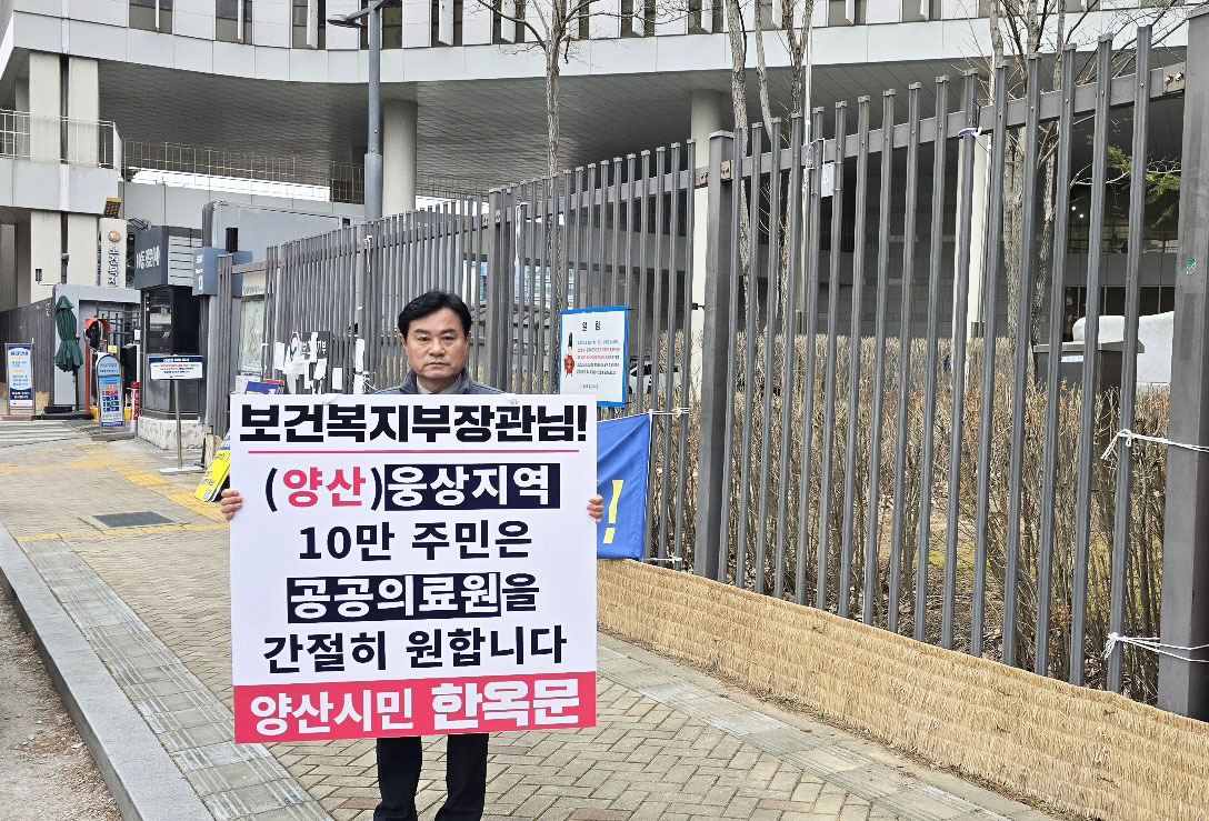한옥문 국민의힘 양산시장선거 예비후보가 24일 세종특별시에 위치한 보건복지부 청사 앞에서 '웅상지역 공공의료원 건립'을 촉구하는 1인 시위을 하고 있다.[사진=한옥문 예비후보] 2026.02.24 |