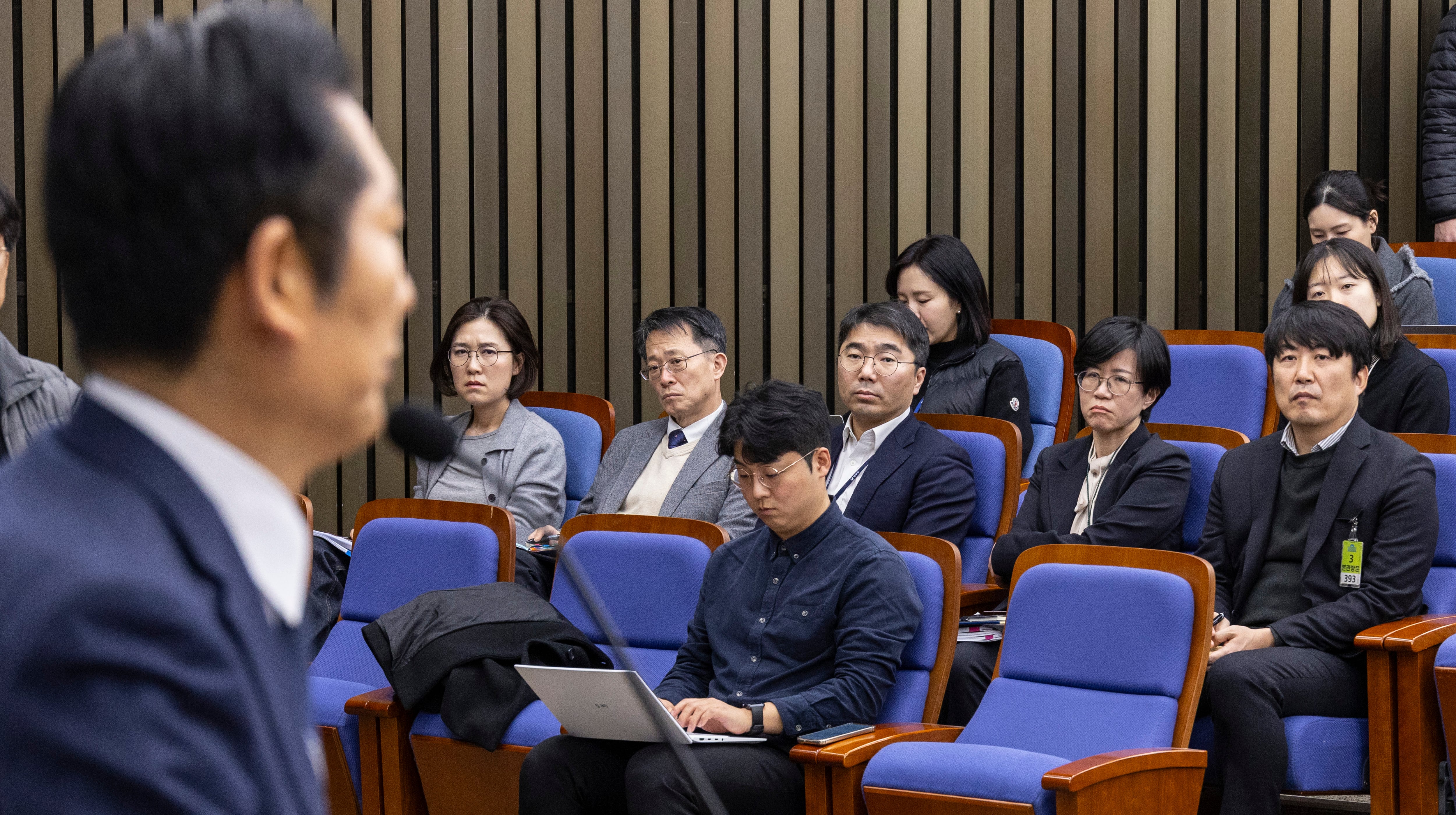 지난 5일 국회에서 열린 더불어민주당 정책 의원총회에서 정청래 대표가 발언하는 가운데, 국무조정실 검찰개혁추진단 관계자들이 공소청법·중수청 설치에 관한 정부 법안을 설명하기 위해 나와 있다. /연합뉴스 |