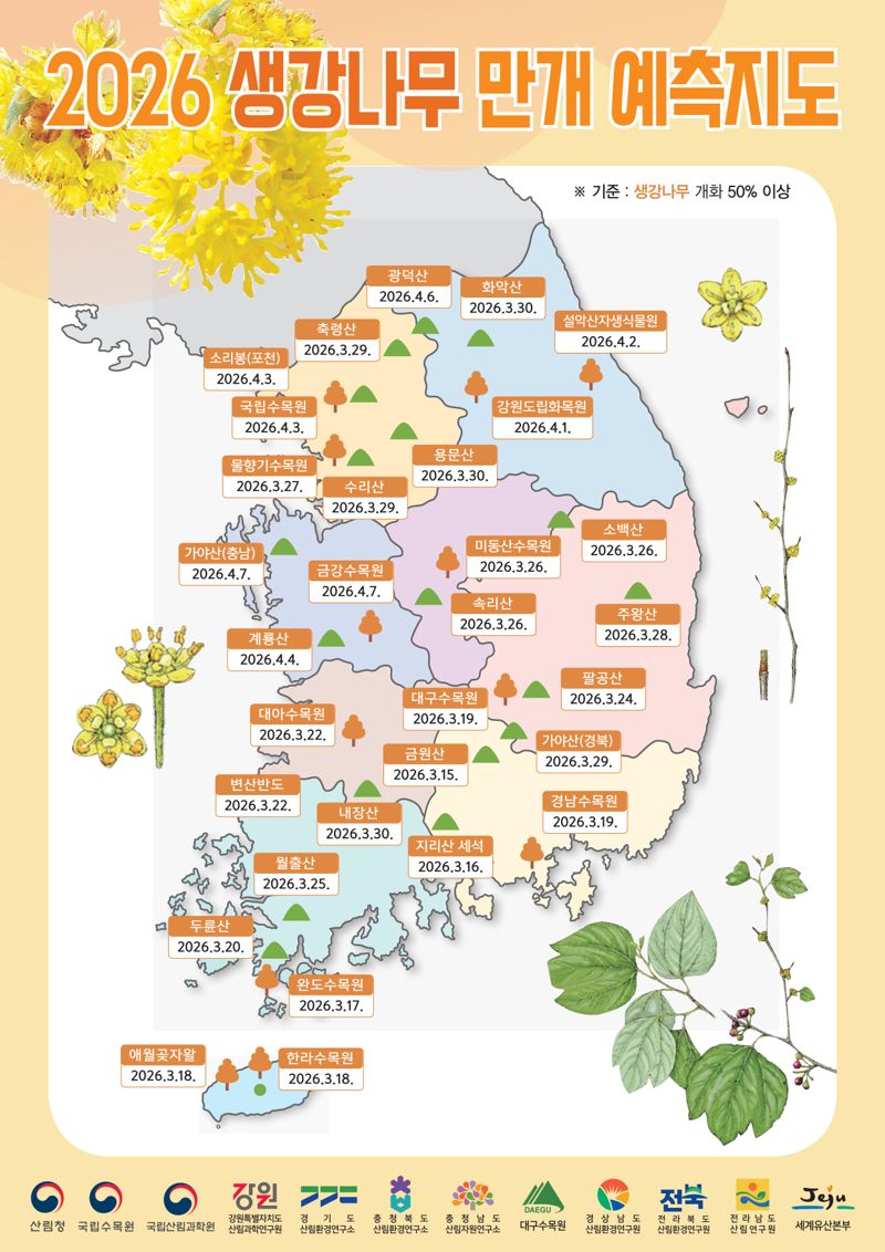 산림청은 24일 봄철 생강나무와 진달래, 벚나무류의 개화 시기를 담은 ‘2026년 봄철 꽃나무 개화 예측지도’를 발표했다.