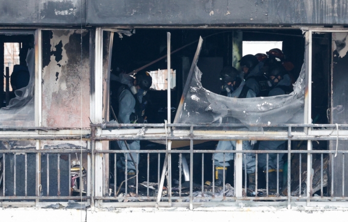 24일 오전 서울 강남구 은마아파트에서 경찰, 소방 관계자들이 화재 원인 조사를 위해 합동 감식을 하고 있다. 소방당국에 따르면 이날 오전 6시 18분쯤 발생한 화재로 10대 여성 1명이 숨지고 3명이 다쳤다./사진=뉴스1. |