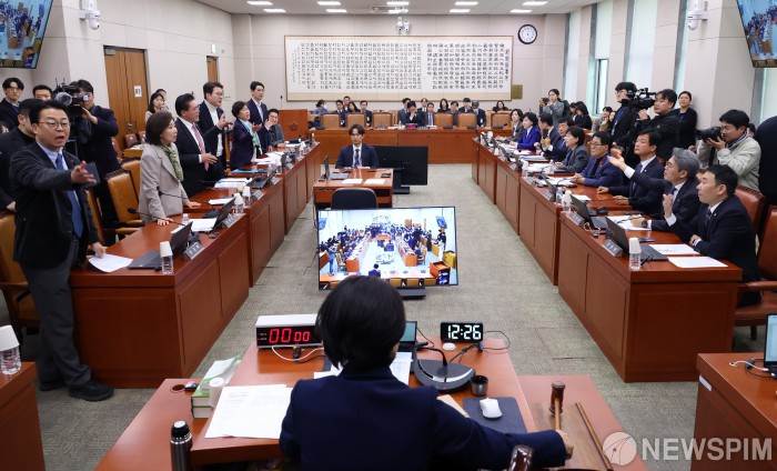 [서울=뉴스핌] 정일구 기자 = 24일 오후 서울 여의도 국회에서 열린 법제사법위원회 전체회의에서 전남·광주통합특별시 설치를 위한 특별법안에 대한 거수 표결이 진행되자 나경원 국민의힘 의원 등 법사위원들이 항의하고 있다. 2026.02.24 mironj19@newspim.com